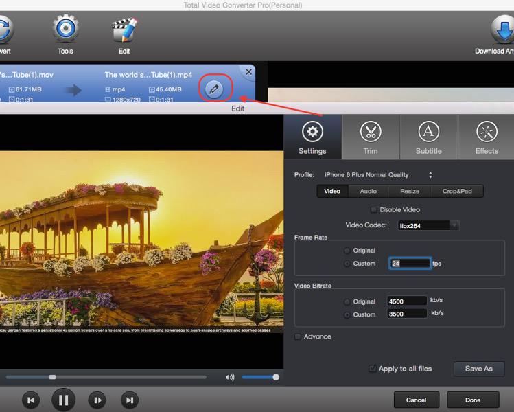 Total Video Converter for Mac OS X comes with a built-in Mac video editor that lets users trim video and audio clips, set fade in / out time of file, crop frame size, merge videos and set the output resolution to suite their needs. Simply import the video and audio files to this software and freely edit them to make fancy home movies.